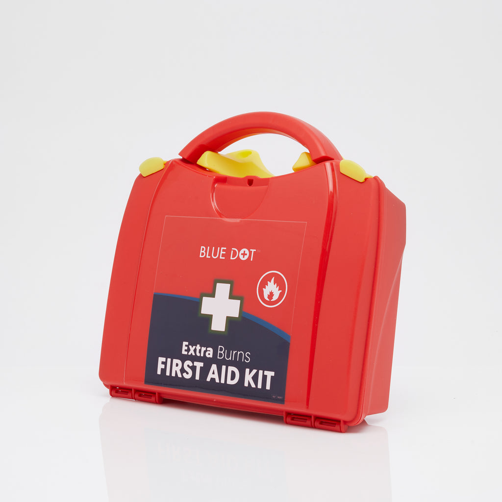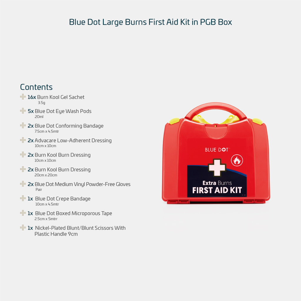 The Blue Dot Burns First Aid Kits are specifically crafted for efficient use in offices, kitchens, and homes. Tailored to address a range of burns, including scalds, these kits offer effective relief. Available in two variations—Standard Burns First Aid Kit and Extra Burns First Aid Kit—each kit contains a mix of larger and smaller dressings, as well as gels. Both versions are well-equipped to provide protection for staff, customers, and family members.